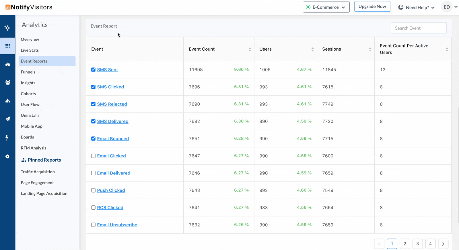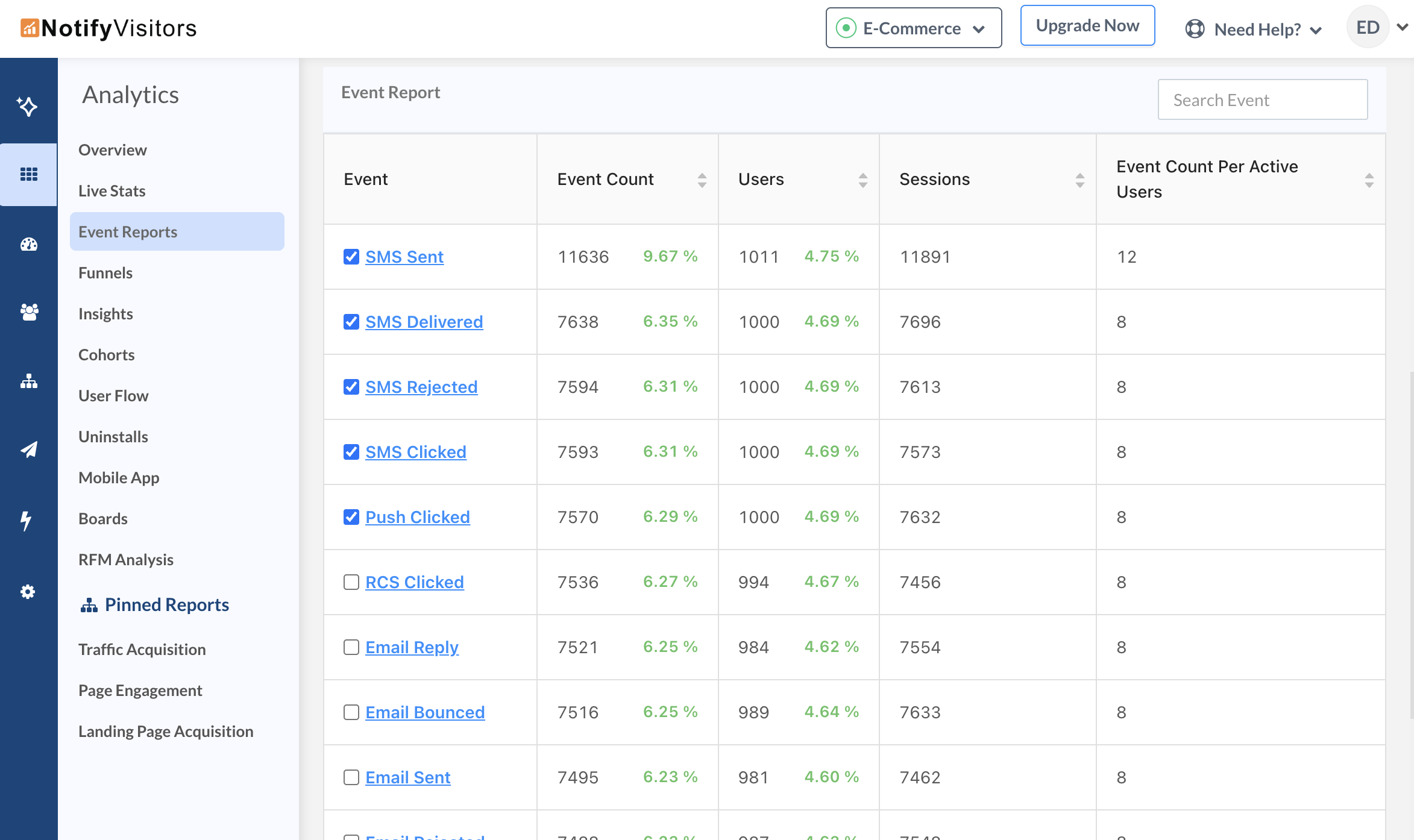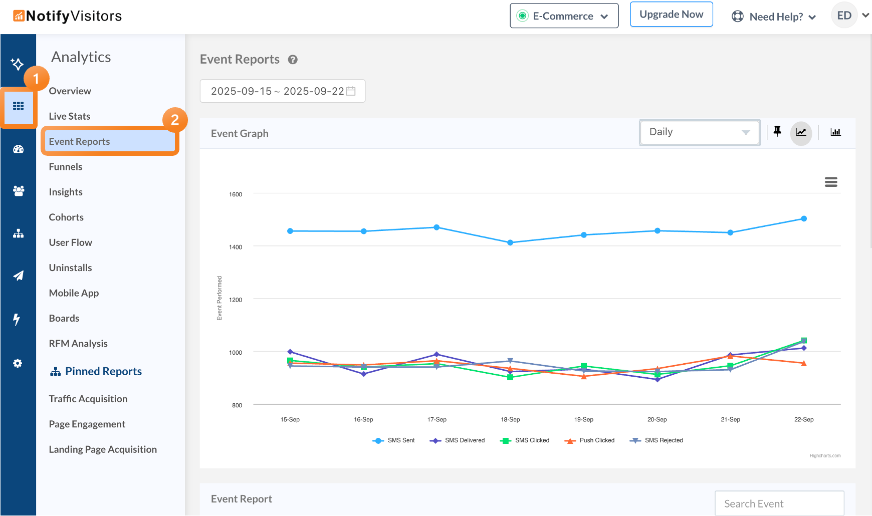 Open the NotifyVisitors console, then from the left menu go to Analytics and choose Event Reports.