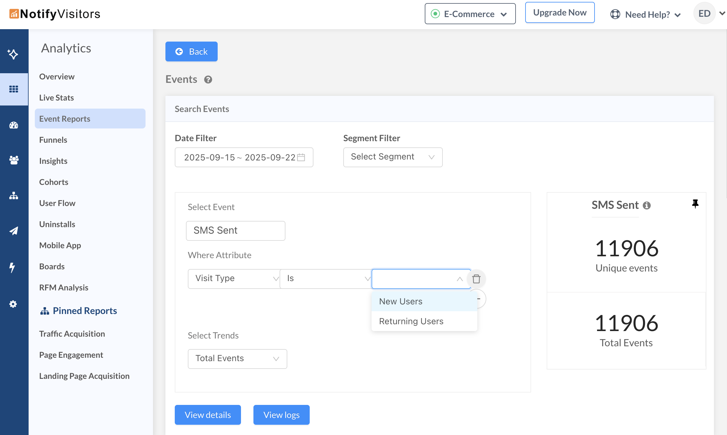 Once you’ve selected your preferred options, click "View Details" button to access in-depth analytics or "View Logs" button to view the logs of your event data.